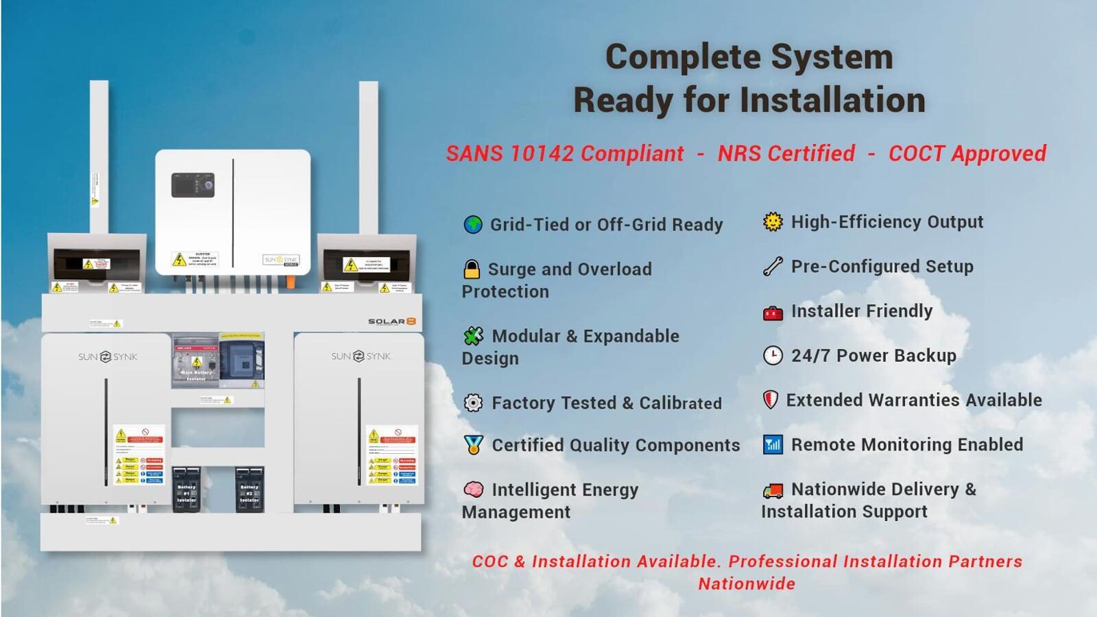 Combos available with various solar panel array sizes, or without panels for reliable load-shedding backup.
